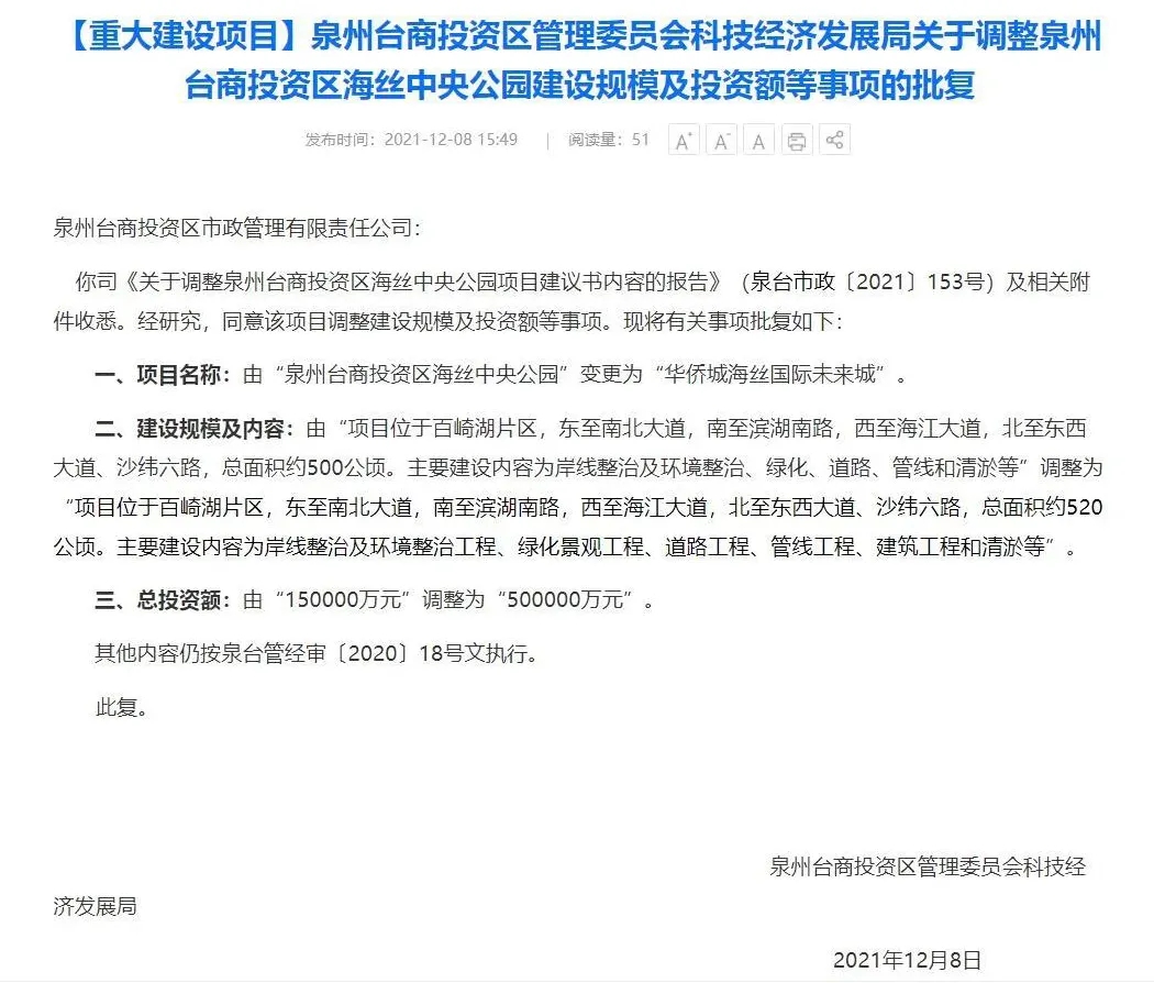 12月8日,泉州台商投资区管理委员会科技经济发展局公开了《泉州台商投资区管理委员会科技经济发展局关于调整泉州台商投资区海丝中央公园建设规模及投资额等事项的批复》,项目名称由“泉州台商投资区海丝中央公园”变更为“华侨城海丝国际未来城”,总投资额:由“150000万元”调整为“500000万元”。